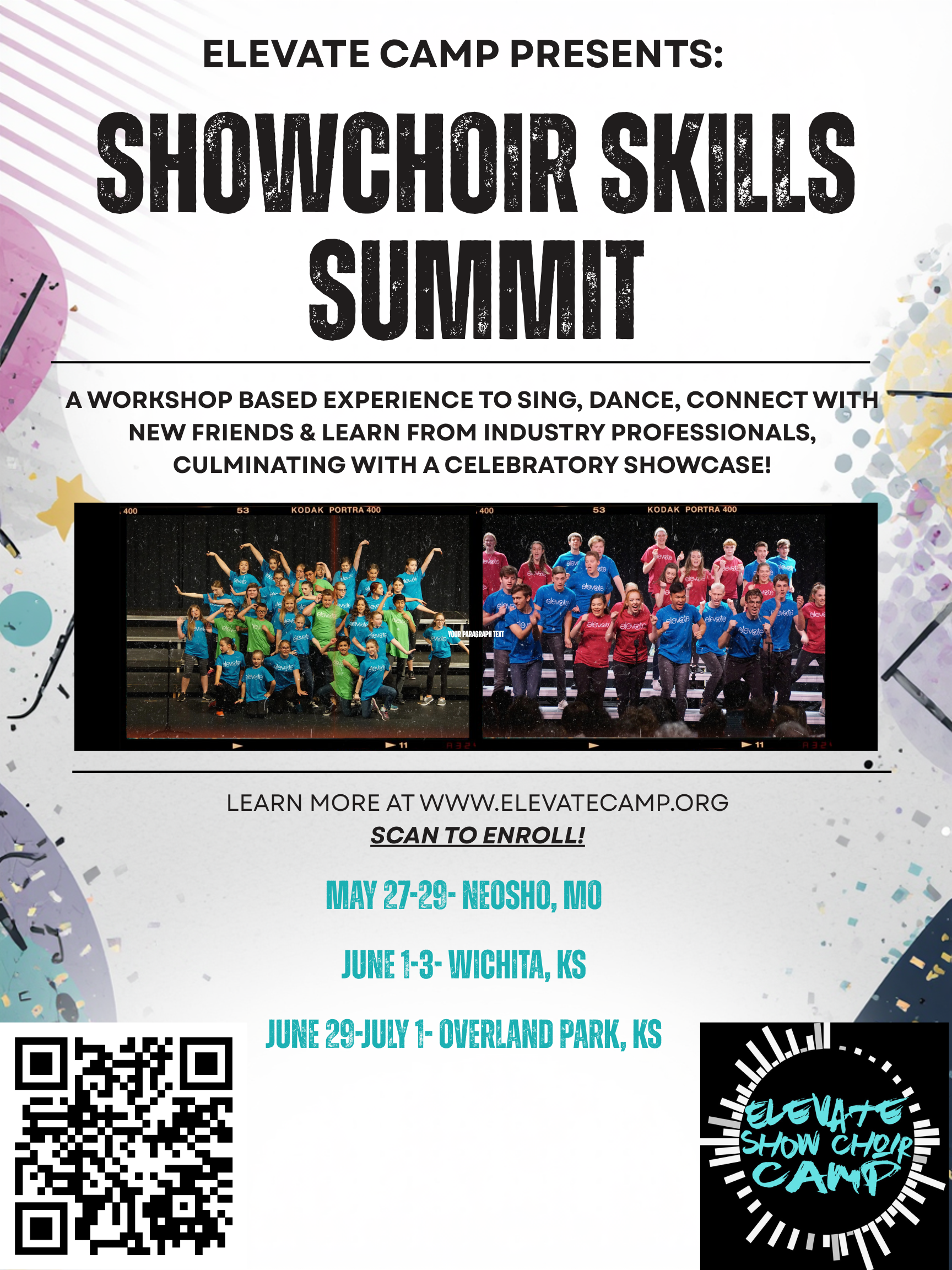 Elevate students will have the opportunity to work with top clinicians in the vocal and dance industries throughout the Summit, culminating in a friends & family showcase on the final day. In true Elevate fashion, The Summit is designed to bring students together from multiple area schools in one collaborative experience. We are so excited to partner with multiple fantastic high school programs to open Elevate to students in various hubs! First we will begin the summer season at Neosho High School in MIssouri, and then we will partner with St. Thomas Aquinas High School in Overland Park, KS.
